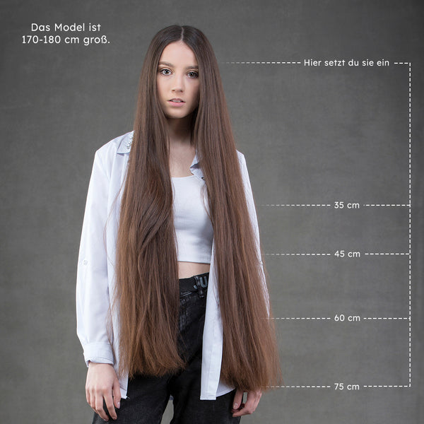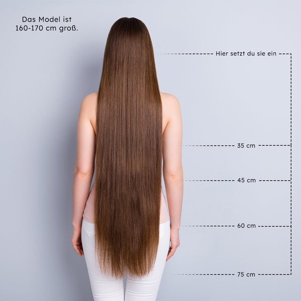 - Ist die Schablone befestigt, platzierst du deine Echthaar-Strähne mit der U-Öffnung nach oben, nahe der Kopfhaut.